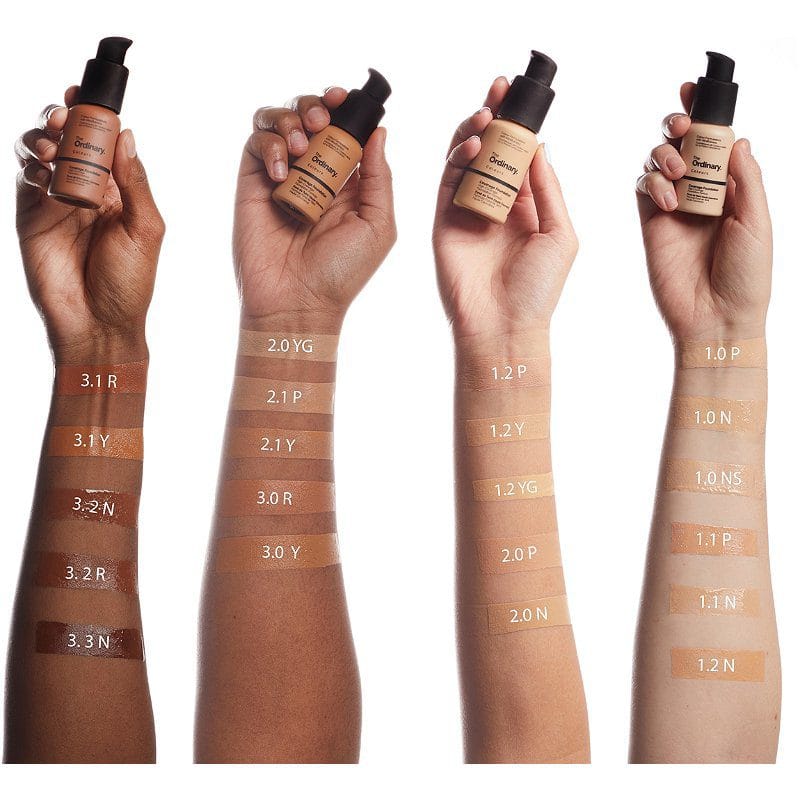 Hay 21 tonos divididos en cuatro categorías: 1 para tonos más claros, 2 para tonos medios, 3 para tonos oscuros/profundos y 4 para tonos más profundos. Cada categoría se clasifica con un segundo dígito del 0 al 4 para indicar la intensidad dentro de cada categoría. Finalmente, se añade una letra al código del tono para identificar el subtono: P (Rosa) y R (Rojo) indican subtonos fríos. N indica un tono neutro. Y (Amarillo) indica un subtono cálido. Nota: El corrector The Ordinary fue formulado para ser ligeramente más claro en comparación con las bases de maquillaje Serum.